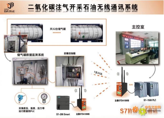 在中國中車集團(tuán),業(yè)主利用達(dá)泰歐美系PLC無線通訊終端——DTD418M,實(shí)現(xiàn)了二氧化碳注氣開采石油無線通訊系統(tǒng)。在現(xiàn)場技術(shù)人員,采用33塊DTD418MB,通過RJ45接口,在S7協(xié)議下,完成中控室S7-1500PLC端及32臺碳儲罐的S7-200SMART之間數(shù)據(jù)無線傳輸。大幅提高了石油資源的開采率,推動綠色能源的發(fā)展。