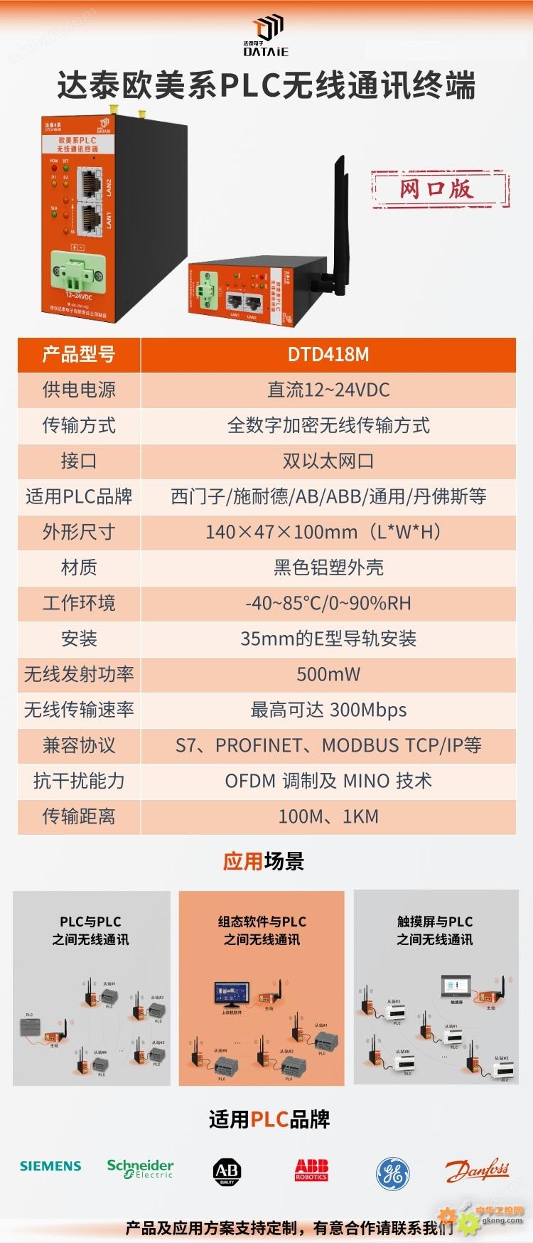 DTD418M 達(dá)泰歐美系PLC無線通訊終端,采用 2x2 兩發(fā)兩收無線架構(gòu),空中傳輸速率高達(dá) 300Mbps,兼容西門子S7協(xié)議、Profinet協(xié)議、Modbus TCP/IP等通訊協(xié)議,并采用 OFDM 調(diào)制及 MIMO 技術(shù),使無線可靠傳輸距離達(dá)到1KM范圍內(nèi)均可使用。適用于西門子、施耐德、AB、ABB等歐美系PLC品牌。